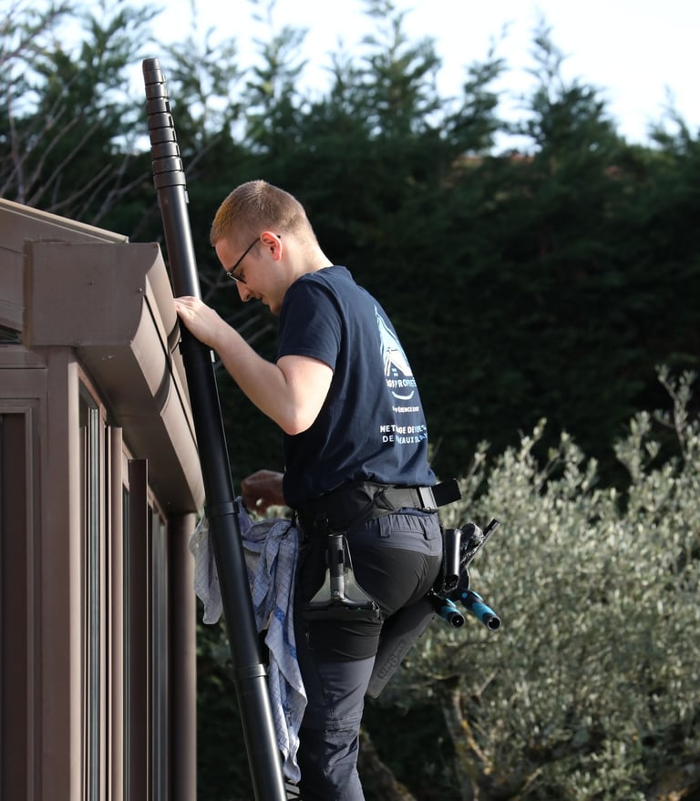 À la date convenue, notre équipe intervient avec du matériel professionnel (eau pure, perches carbone, équipements sécurisés). Le nettoyage est réalisé avec soin pour un résultat impeccable et sans traces.