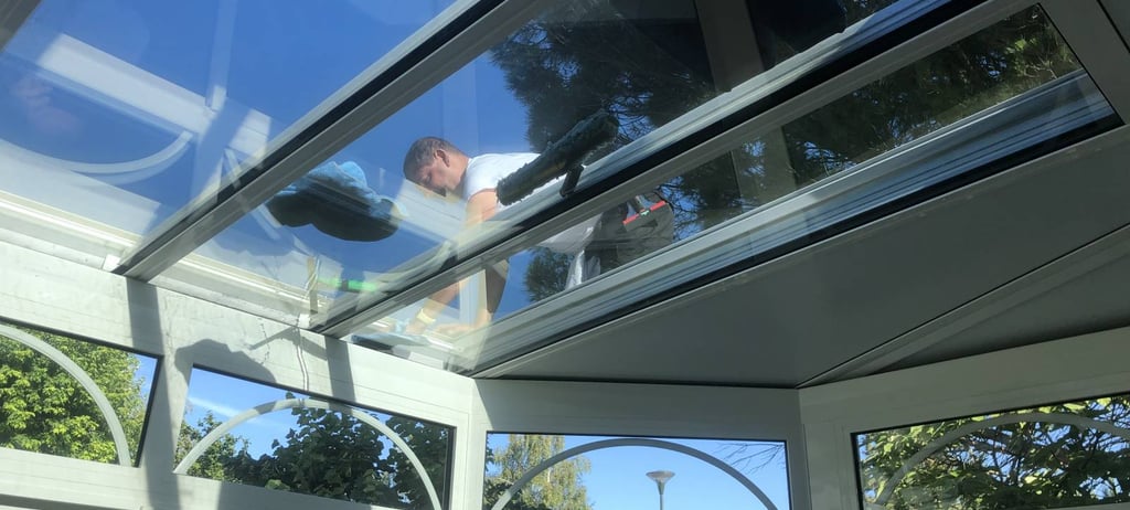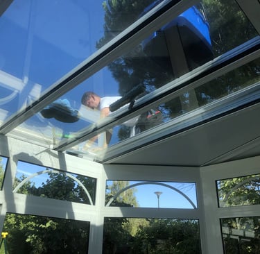 Les vitrages inclinés, toitures vitrées ou baies très hautes nécessitent des méthodes adaptées.