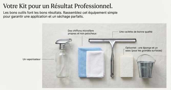 Utilisez une raclette en partant du haut vers le bas, par bandes verticales. Essuyez immédiatement avec un chiffon microfibre propre. Les mouvements en S ou circulaires aident à éviter les marques.